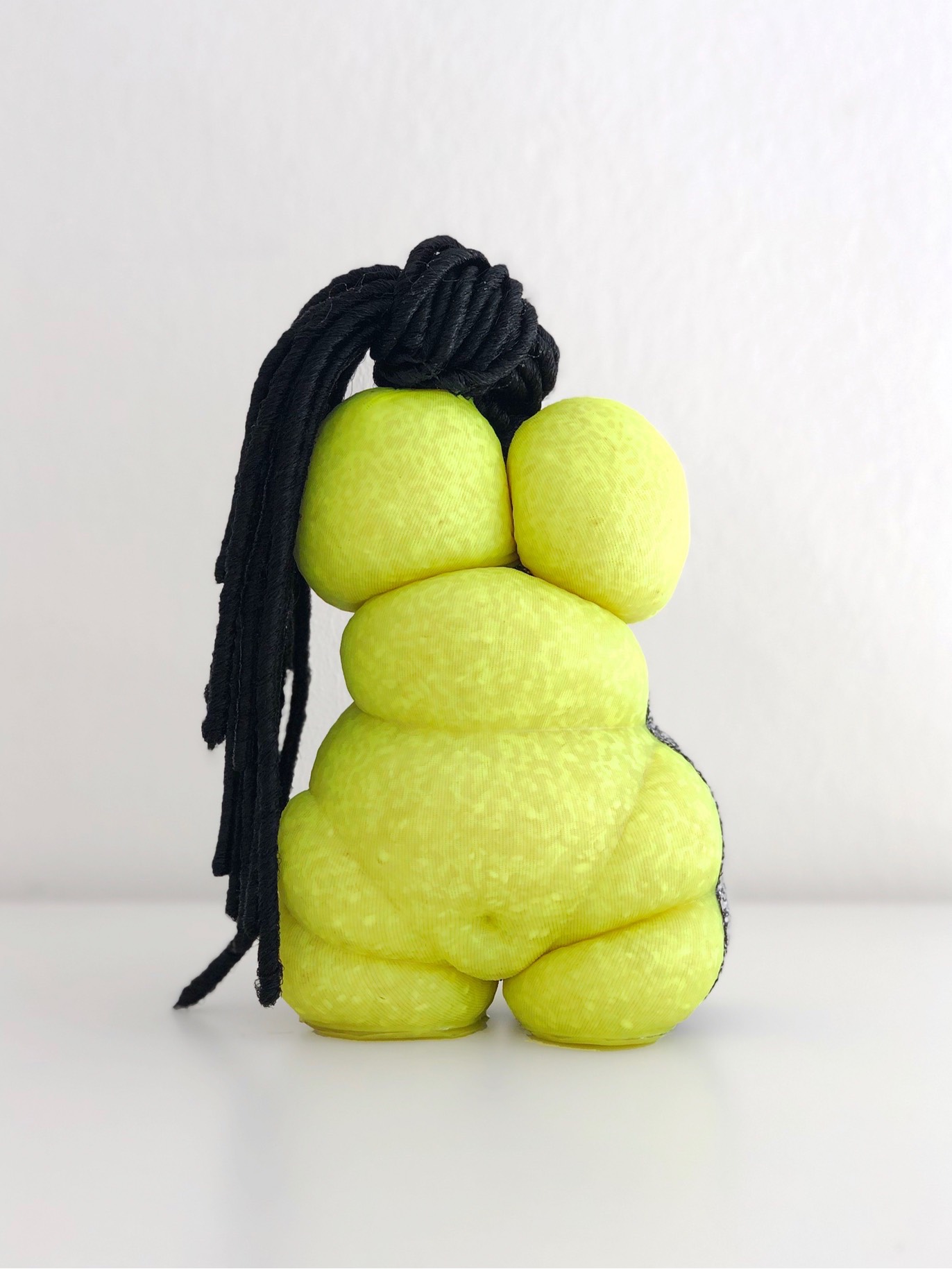 Fabric, synthetic hair, thread, plastic, rice, 30×13×11cm Belly dancer N°3, 2013, Synthetic fabric, thread, rice, 55×19×8cm